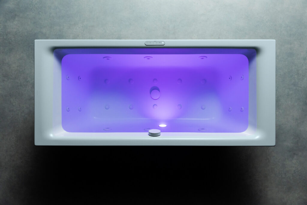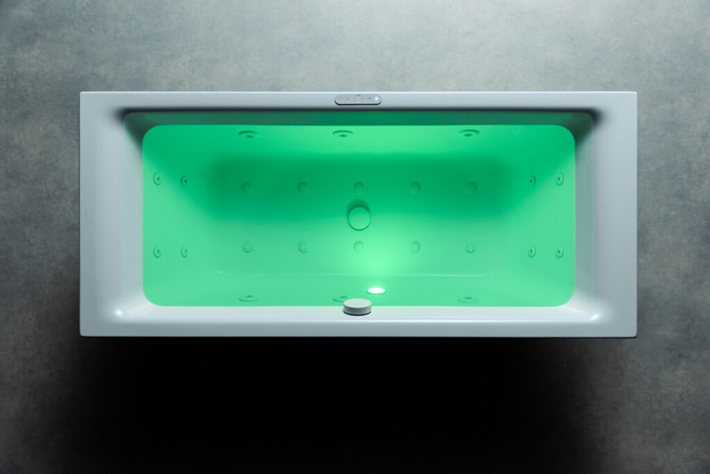 Mit ihrer Spektrallicht-Funktion sorgen die Whirlsysteme von Kaldewei für ein faszinierendes Spiel aus Licht, Luft und Wasser. Ob ein anregendes, tiefes Rot, ein sanftes, seidiges Grün, ein luftiges Blau oder ein neutrales Weißlicht – seit jeher ist die positive Wirkung von Licht und Farbe auf Körper und Geist bekannt und sorgt in Verbindung mit Wasser für noch mehr Tiefenentspannung. Für das ultimative Wellness-Erlebnis lässt sich so ganz einfach eine wohltuende Wasser- oder Luftmassage mit der Energie des Spektrallichts kombinieren.